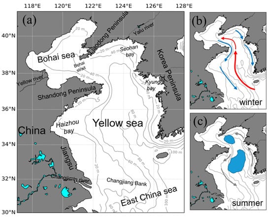 (a) Location and bathymetry of the Yellow and Bohai Seas. (b) Winter circulation pattern diagram, where red arrows and blue arrows represent the Yellow sea warm current and cold coastal currents, respectively. (c) Summer circulation (gray arrows) diagram, where the blue area represents the Yellow Sea cool water mass.