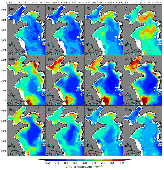 3.1. Satellite-Derived Monthly Chl-a Pattern