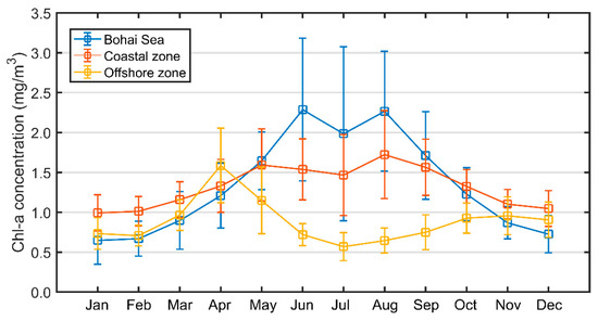 Average monthly chl-a concentration in the Bohai Sea, the Yellow Sea Coast, and the Yellow Sea offshore zones.