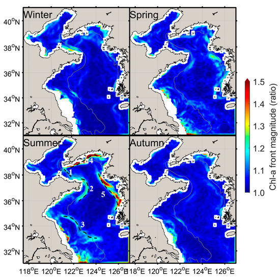 Figure 4 illustrates the seasonal chl-a front pattern. There are five notable chl-a fronts which manifest stripes denoting a strong chl-a gradient in the Yellow Sea during summer: the Bohai Strait (BS) front, Shandong Peninsula (SP) front, Jiangsu (JS) front, Liaodong Peninsula (LP) front, and Korean Peninsula (KP) front. These five fronts are located near the coast and are largely parallel to the coastline, except for the BS front. The location of the fronts also corresponds to those of the SST fronts, as determined by [6] and this study (see Section 3.3). The maximum magnitude of the five fronts was higher than a 1.2 ratio and even higher than 1.5 in the LP and KP fronts. However, there are no distinct chl-a fronts in other seasons (i.e., other than summer), only small regions north of the Shandong Peninsula and in the Korean Peninsula coast in winter. As shown in Figure 5, the interannual variability of the five chl-a fronts is basically smaller than 0.2. Relatively high variability (~0.3) occurs at the offshore water near the Changjiang estuary and the north of the KP front.