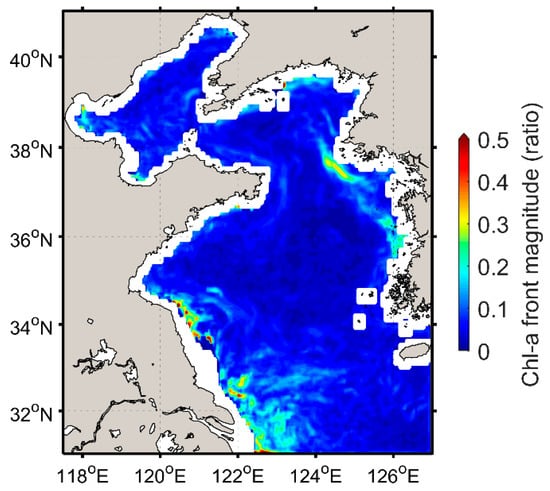 The chl-a data horizontal resolution was 4 km × 4 km, and this study focused on the seasonal characteristics of the chl-a front. Therefore, the data from June 2002 to December 2016 were averaged monthly to obtain monthly chl-a concentrations. The monthly data were then used to characterize the monthly variability of chl-a patterns and fronts.