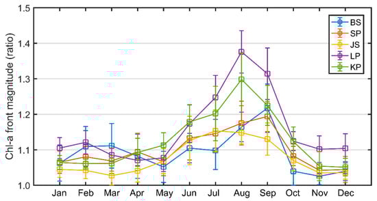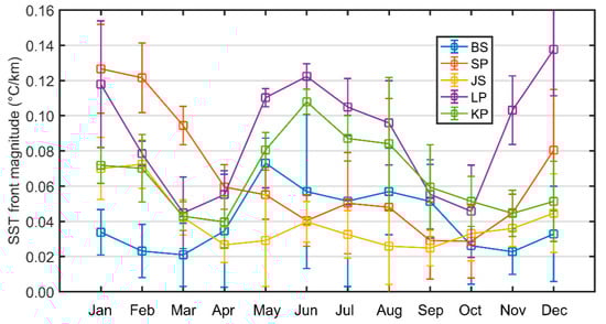 The location of the SST fronts basically coincided with that of the chl-a fronts (Figure 7). The SST front magnitudes within the five chl-a front zones were spatially averaged as shown in Figure 8, and two SST front peaks were observed in winter and summer. In January and February, the SST fronts were strong [6], especially in the SP front, which was induced by strong surface cooling and the shear between the coastal cold current and the Yellow Sea warm current (e.g., [17]). However, the SP and JS fronts weakened from March to December. In contrast, the LP and KP fronts increased from May to August; both maximum front magnitudes occurred in June. The five fronts were relatively weak in April, September, and October.