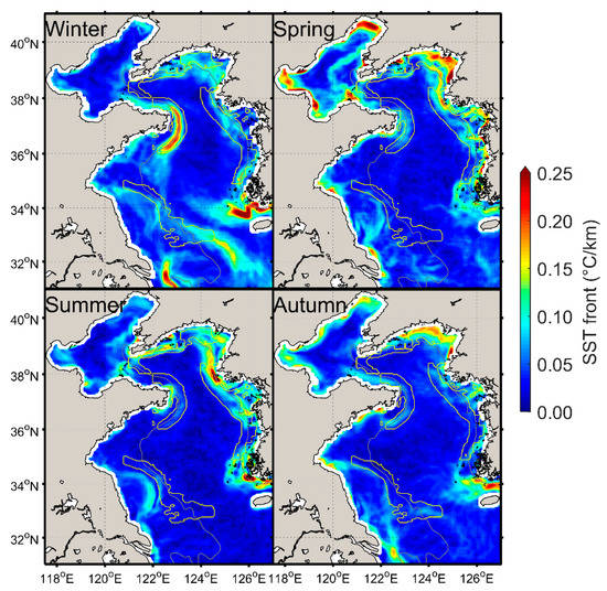 As illustrated in Figure 7, the SST fronts in the Yellow Sea largely persisted throughout the four seasons. The SST fronts occur in Bohai Strait (BS) and along the Shandong Peninsula (SP), Liaodong Peninsula (LP), Korean Peninsula (KP), and Jiangsu (JS) coastal areas, which is consistent with previous studies (e.g., [6,17,29]). The SST fronts are relatively strong in winter, especially in the Yellow Sea western coasts, and are weak in autumn. In spring and summer, the SP and JS fronts are relatively weak. However, the BS, LP, and KP fronts remain strong.