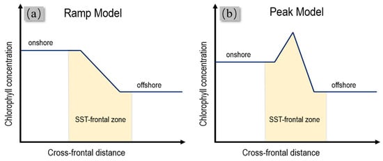 Chl-a fronts always coincided with SST fronts [2]. Basically, there are two main patterns of chl-a across the SST-frontal zone (Figure 10), which were summarized by [2]. SST fronts along the coast could act like dynamic barriers to momentum and offshore water transport [2,44], and thus become boundaries between higher coastal biomass on one side, and lower offshore biomass on the other (i.e., ‘Ramp Model’ in Figure 10a). SST fronts could also induce maximum chl-a concentrations along the front (i.e., ‘Peak Model’ in Figure 10b) via convergence and nutrient upwelling, and, in both cases, the strongest chl-a gradients (i.e., chl-a fronts) are located at the SST frontal zone.