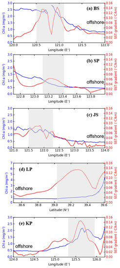 Chl-a concentration and SST gradient across the five fronts in August. (a–e) Transects along 38.3° N, 37° N, 34° N, 123.8° E, and 37° N, respectively. The gray shadings indicate the SST-frontal zones.