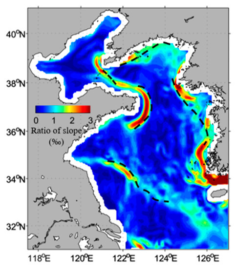 Furthermore, both the variable chl-a and SST fronts consistently occurred within steep seabed slopes (ratio of slope > 1%) (Figure 12). Several studies have indicated that topography is a potentially important factor for the formation of fronts (e.g., [17,39]). Topography likely influences the formation of fronts through two main mechanisms. First, based on the geostrophic balance or conservation of potential vorticity, the flow should follow the isobaths [1]. Therefore, little heat and material transport occur across steep slopes, which led to different nutrient environments between coastal and offshore waters, thus facilitating front formation. Second, tidal fronts usually form in locations with steep slopes [17,38]. Since the formation of tidal fronts is related to the energy balance of heating and tidal mixing, which is proportional to the water depth [48], the depth of steep-sloped regions with variable water depths was easier to determine when said energy balance was known. These tidal fronts could be regarded as the boundary between well-mixed and stratified waters, which influenced chl-a concentration and limited its cross-frontal exchange, as discussed in Section 4.1 and Section 4.2. Both the limitation of cross-isobath exchange and the tidal front facilitated the formation of chl-a fronts in location with steep slopes, suggesting that seabed slope may be a valid indicator of the location of oceanic fronts on the climatological scale.