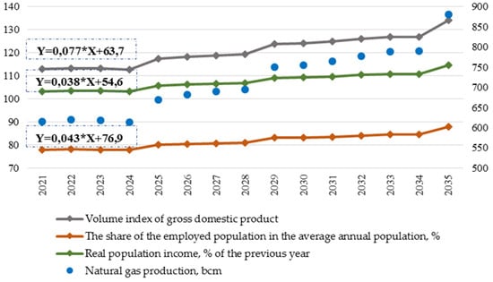 Figure 4 presents a graph reflecting the dependency of socio-economic development in the region on gas production, which is accompanied by the regression equations that were used.