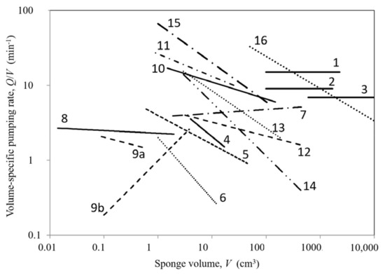 The available literature data on pumping rate versus size of demosponges covers six decades of volumes from small single- and multi-oscula explants to large temperate and tropical sponges of various forms (Table 1). The morphological scaling is presented in terms of power-law regressions of volume-specific pumping rate versus volume (Q/V = aVb), which shows a variety of trends of positive, near-zero and—most often—negative exponents b (Figure 1). Alternative scaling involving the parameters pumping rate Q, sponge volume V, osculum cross-sectional area OSA, and exhalant jet speed at osculum U (Equation (1)) are summarized in [7].
