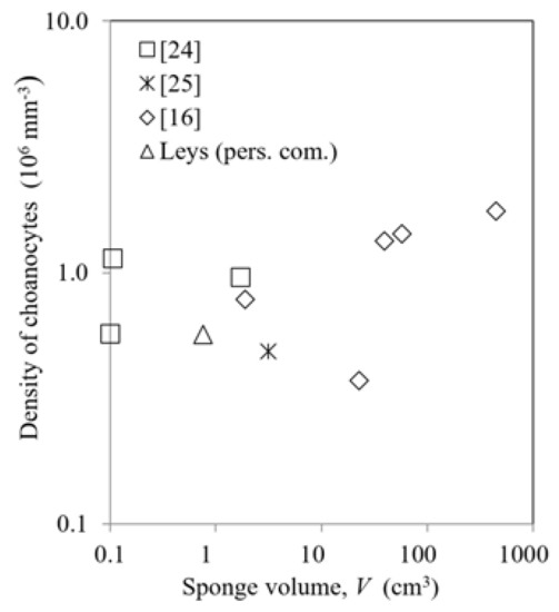 From the available data, it appears that the most fundamental feature of scaling laws of pumping rate is associated with the performance of the choanocyte pumps driving the flow against the pressure losses determined by the morphological structure of the aquiferous system of canals and restrictions, which are determined by several characteristic length scales [16]. Data on choanocyte density (Figure 2) show no clear trend for increasing sponge size, but all appear to be of the order of 106 mm−3 within a factor of about 2. Therefore, the modelling in next section provisionally assumes density of choanocytes to be constant.