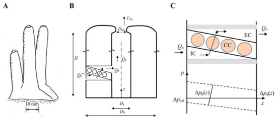 Recognizing the structural differences in the geometrical form of different sponges, we consider three basic variants defined by the same four length scales, H, DO, Da, Dosc: (i) The slender tubular form (Figure 3A) where increasing size is due to increase primarily in height and less in diameter; (ii) the massive or encrusted form Figure S1H–L in [7], represented by a cylindrical form where increasing size is due to increase primarily in diameter and less in height, e.g., due to new aquiferous modules growing next to existing ones in multi-oscula sponges; (iii) the small cone-shaped single-osculum explants Figure 1 in [17] where increasing size is probably due to increase of both height and diameter. The individual modules of explants Figure 1 in [15] may be treated as the slender tubular form. For the tubular cases, volume and canal length are defined in Figure 3 as V = (π/4) DO2 H and L = (DO − Da)/2, respectively. For the cone-shaped case, V = (π/12) DO2 H and the average canal length is approximated by L = (DO − Da)/4 and the outer surface area by As = π (H2 + DO2/4)1/2 DO/2.