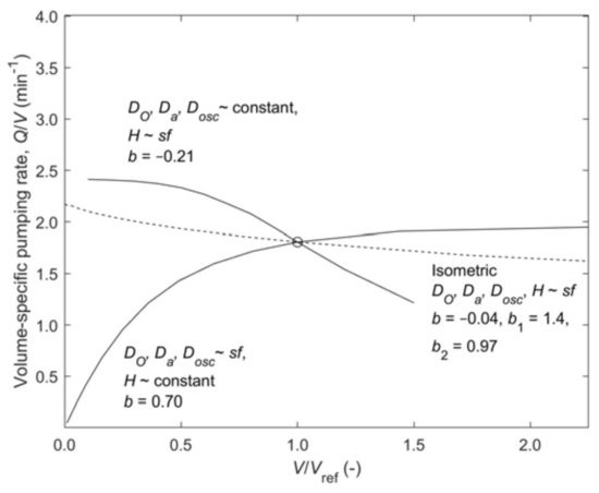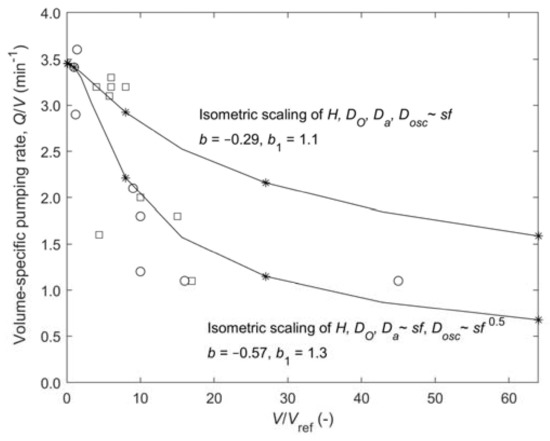 For realistic results, the model is based on the data for the “standard sponge” Haliclona urceolus [19] which is used as the reference sponge and for which the equation of pump characteristic was developed [27]. Reference values appearing in results are Vref = 1.86 cm3, (Q/V)ref = 3.41 min−1 and Qref = 6.34 mL min−1, and an isometric scaling with sf = 0.25 to 4 will cover a range of sponge sizes from 0.029 to 119 cm3. The model results in Figure 4 for isometric scaling (H, DO, Da, Dosc~sf) and a modified scaling (H, DO, Da, ~sf, Dosc~sf1/2, i.e., OSA~sf) are compared to the scarce experimental results for Halichondria panicea and H. urceolus (b = −0.6 and −0.39, respectively, of #4 and #5 of Table 1). The case of modified scaling implies a reduced OSA, hence increased exit pressure loss and thus reduced pumping rates that seem to fit the data better, hence supporting the credibility of the model.
