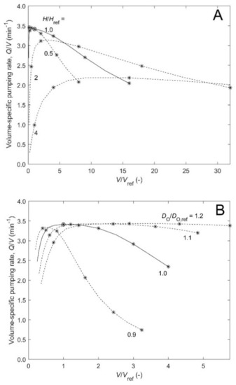 Tubular sponge flow model. Volume-specific pumping rate (Q/V) versus normalized size (V/Vref) for 3 cases constrained by the experimental correlation OSA = a4Vb4. (A): a4 = 9.42 and b4 = 0.6 and (B): a4 = 3.81 and b4 = 0.56 from Figure 5A in [7]. Isometric increase of H, DO, Da by scale factor sf = 0.5 to 4 for 4 (dashed), H constant, and diameters DO, Da constant, respectively, (solid). Values of exponents b, b1 and b2 (see Equation (1)) of power-law fit for sf > 1.5 shown.