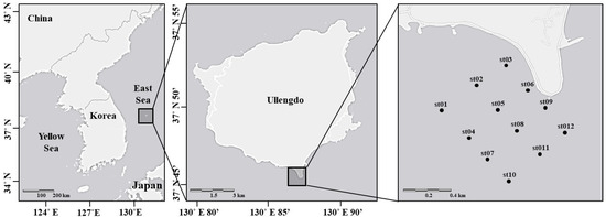 - Kim, S.T.; Hwang, K.S.; Park, G.J.; Choi, C.G. Benthic algal community of Ulleungdo, East coast of Korea. J. Fish. Mar. Sci. Educ. 2016, 28, 83–90. [Google Scholar]