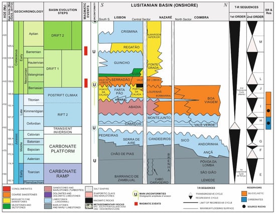 - Pena dos Reis, R.B.; Pimentel, N.L.; Garcia, A.J.V. A Bacia Lusitânica (Portugal): Análise estratigráfica e evolução geodinâmica. In Boletim de Geociências da Petrobras: Bacia Lusitânica; Milani, E.J., Zalán, P.V., Spadini, A.R., Machado, D.L., Jr., Silva, E.F.F., Terra, G.J.S., Bueno, G.V., Eds.; Petrobras: Rio de Janeiro, Brasil, 2010; Volume 19, pp. 23–52. [Google Scholar]