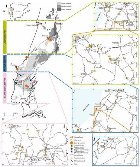 (a) Geographical location of the Lusitanian Basin; (b) Jurassic geological map of the Lusitanian Basin; (c) Location of the lagoon sector showing the Cumieira Section, the Abiul Section, and five control outcrops; (d) Location of the Cumieira Section, the Abiul Section, and ten control outcrops in detail; (e) Location of the lagoon-barrier sector showing the Praia do Salgado Section and the Praia da Consolação Section; (f) Location of the lagoon-barrier sector showing the Praia do Salgado Section and two control outcrops in detail; (g) Location of the marine-distal sector showing the Pedralvo Section and eight control outcrops.