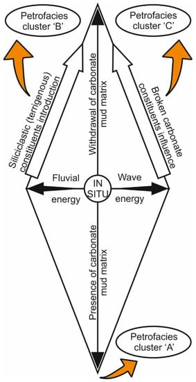 Environmental energy factors controlling the distribution of petrofacies characterized in this work which define the main petrofacies clusters (A, B and C) (according to Garcia et al. []).