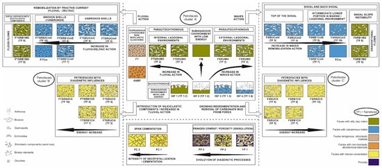 Petrofacies characterization and petrofacies clusters, associated with depositional environments, degree of remobilization, and fossil-diagenetic intensity (modified after Garcia et al. []).