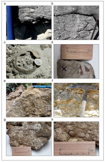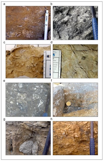 Photographs showing the results of different mechanisms of taphonomic alteration in coquina deposits, namely, (a) disarticulated elements with orientation; (b) unbroken elements with low fragmentation (partial); (c) unbroken and broken elements disarticulated with preferential orientation; (d) elements with chaotic orientation; (e,f) abrasion intense processes; (g) fragmentation intense processes; (h) fragmentation intense processes and important contribution of terrigenous constituents.