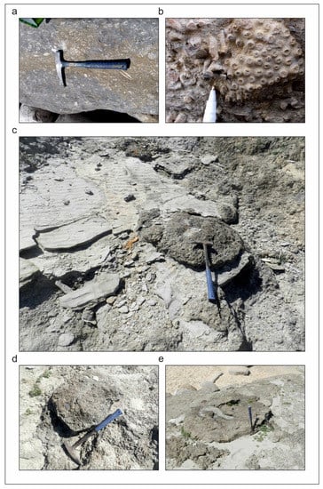 Most of the allochemical constituents recognized in the Amaral Formation display a large size. In this context, the recognition of diagenetic processes can be performed through macroscopic analysis carried out in the field and in the laboratory. Diagenetic processes can be recognized in all taphofacies which, in this case, refer to neomorphism processes, namely micritization (Figure 6c,d) and recrystallization (Figure 6e,f). The first is recognizable in TF 1.1, TF 1.2, TF 2, TF 3, TF 8, and TF 9 taphofacies; the second, on the other hand, is particularly well represented in taphofacies that show complete and large not organically bounded elements, namely in TF 1, TF 2, TF 3, TF 4, and TF 5 taphofacies. The formation of concretions has been recognized in taphofacies related to low-energy environments. These occur due to an increase in the alkaline concentration around the elements and are usually related to the first stages of diagenesis; they occur in TF 4.3, TF 5.3, TF 6.3, TF 7.3, TF 8, and TF 9.3 taphofacies (Figure 6g,h).