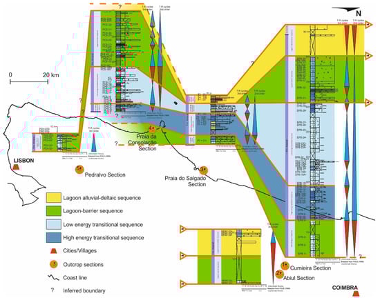 The lagoon-barrier sector corresponds to the narrowing, towards the south, of the lagoon located to the north of the basin. It is characterized by the occurrence of expressive reef bodies, as well as barrier islands, composed of bioclastic or oncolitic fragments. It is noteworthy, in this sector, to mention the occurrence of coarser continental sediments, coming from the uplifted margins of the basin (Berlengas to the west, and Ota to the east). In this region, the Amaral Formation was analyzed based on the study of the Praia do Salgado (Famalicão) and Praia da Consolação (Atouguia da Baleia) sections and two outcrops for lateral and vertical control of facies (Figure 2d,e).