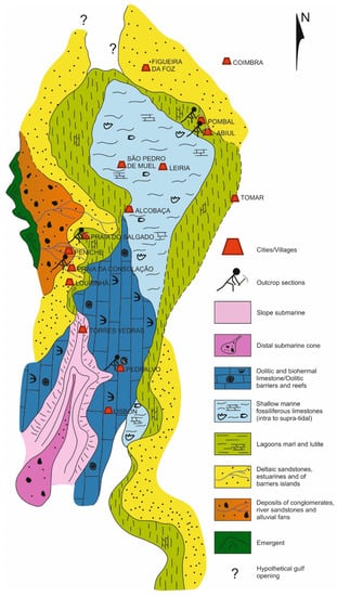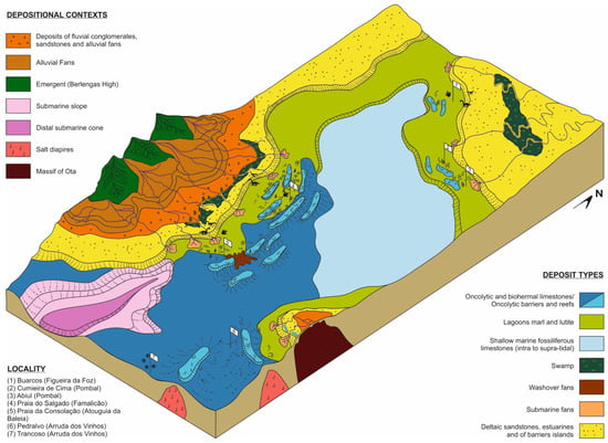 Paleoenvironmental sketch of the upper Kimmeridgian of the Lusitanian Basin (modified after Pena dos Reis et al. []; modified after Garcia et al. []).
