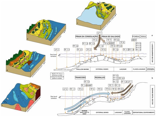 Theoretical models of distribution of taphofacies for the coquina deposits of the Amaral Formation in the context of a heterogeneous platform, namely, of two types: (a) continuous platform (e.g., Pombal platform for SW and Berlengas platform for E–SE); (b) isolated platform (e.g., Ota platform). Shown are 3D paleoenvironmental models of the depositional systems for the sectors studied based on the distribution of the taphofacies in the different sectors of the platform, namely, (c) depositional model of the marine-distal sector; (d,e) depositional models of the lagoon-barrier sector; (f) depositional model of the lagoon sector.