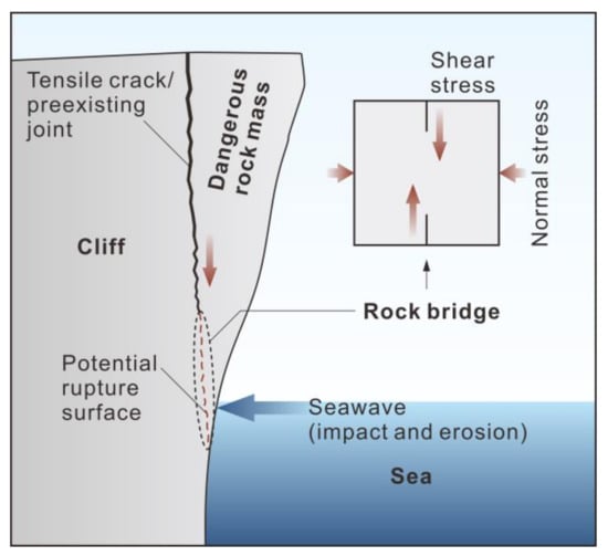 Owing to the impact and erosion effect of sea waves, a coastal cliff can be gradually undercut [7]. Under this circumstance, the stress state of the upper segment of the cliff is similar in nature to that of a cantilever beam; thus, vertical tensile cracks can generate (or initiate from pre-existing joints) and propagate downward (Figure 1). A dangerous rock mass defined by the cracks (joints) connects with the cliff through an unbroken segment at its bottom, i.e., a rock bridge. The rock bridge is subjected to a shear load along the vertical crack and its strength is gradually undermined (Figure 1). Once the rock bridge ruptures, the dangerous rock mass will separate away from the cliff rapidly, causing a catastrophic collapse as well as the recession of the coastline. That is, the rock bridge is the key internal factor controlling the evolution of cliffs, and cliff collapses cannot be directly triggered by certain external factors before rock bridges rupture. Hence, we concentrate on the damage process of rock bridges, which is the groundwork for uncovering the evolutionary mechanism of collapses.