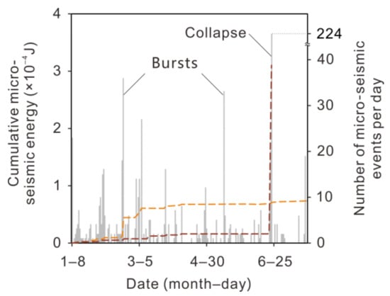 Essentially, volume expansion is attributed to the rapid growth and coalescence of a large number of cracks in rocks [16,17], which can generate abundant acoustic emissions (AEs) in laboratory tests [18]. Moradian et al. [19] divided the damage process of rock bridges under compression-shear load into several stages according to the burst of cumulative AE number and the macroscopic failure pattern captured by high-speed photography; their results indicate that it is feasible to identify the volume-expansion point using AE characteristics. AE and micro-seismic techniques have been increasingly applied to monitor the stability of rock masses (including coastal cliffs) in recent years [5,20,21]; however, due to the heterogeneity of rocks, the local coalescences of cracks and the corresponding bursts of cumulative number of AEs or micro-seismic events can arise several times during the damage processes of rocks. For example, Senfaute et al. [21] reported that such bursts of micro-seismic events arose before the coastal collapse on 23 June 2002 at Mesnil-Val, NW France (Figure 2). Thus, volume-expansion points cannot be reliably identified only by relying on the burst of cracking event number; the energy characteristics (e.g., energy level) in distinct stages of the damage process of a rock bridge should also be taken into account.
