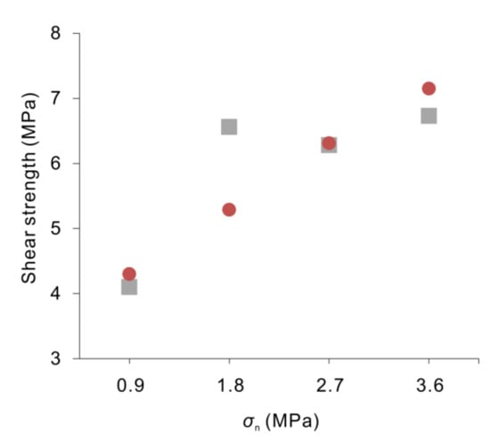 The shear strength values from LT (grey squares) and NT (red solid circles) under various normal stress σn.