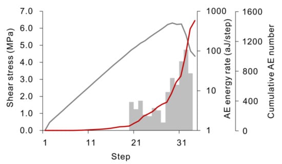 We attempted to clarify the formation mechanism of the special AE activity pattern from the volume-expansion point. Zhang et al. [23] argued that the energy level of an AE event is dependent on the intensity of the stress concentration at the place it arises. As the shear stress field of NT2.7MPa shows, the stress concentration was gradually enhanced at the joint tips as the shear load increased (Figure 9a,b). The AE events generated before the volume-expansion point had a lower energy level owing to the less intensive stress concentration. When the rock bridge was damaged enough to reach its volume-expansion point, the two joint tips were the places where the shear stress concentrated intensively (~21.9 MPa; Figure 9b) on the rock bridge, and thus the newly-generated shear crack and the corresponding shear-mode characteristic AE events appeared there. After the shear cracks formed, the level of shear stress at their tips (~15.0 MPa; Figure 9c) was lower than that corresponding to the occurrence of the characteristic events. This is probably because the coalescence of preexisting cracks is easier than the generation of new shear cracks and therefore requires less elastic strain energy. In this context, the less intensive stress concentration corresponds to the lower energy level of AE events. The stress concentration at the rock bridge gradually enhanced again as its peak-stress point was approaching, because the load that the broken elements were burdened with was transferred to the remaining unbroken elements (local shear stress > 36.0 MPa; Figure 9d) on the rock bridge with the accelerating growth of the shear cracks. Only when these elements fail can the rock bridge rupture. Since these elements have high strength and accumulate abundant elastic strain energy, they can generate quite a few AEs with a high energy level when the rock bridge ruptures. This is a possible explanation for why AE events with a high energy level occur at the volume-expansion and peak-stress points of a rock bridge while those events between them have a lower energy level.