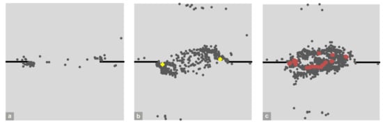 The spatial distribution of AE events of the asymmetric NT2.7MPa of which the half left part is with lower strength. (a–c) correspond to the end of the stable crack growth, the end of the unstable crack growth stage, and the end of the loading process. The yellow diamond and red solid circle denote the characteristic event and mainshock, and the grey solid circles indicate other events.