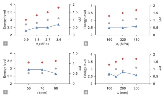 Although the energy level of both characteristic events and mainshocks changes with those parameters, it is notable that the differences of their energy level, ∆M, (i.e., the energy ratio between the peak-stress and volume-expansion points) fall into the range of 0.5–0.7 in most cases (Figure 8); in other words, the values of ∆M are approximately constant. We found that the average of ∆M and its standard deviation was 0.63 ± 0.13. Similarly, the shear stress ratio σc/σf and shear strain ratio εf/εc (subscript “c” and “f” indicate volume-expansion and peak-stress points) of these cases were generally constant, and their averages and standard deviations were 0.79 ± 0.06 and 1.39 ± 0.13. These characteristics imply a specific internal mechanical relation between the volume-expansion and peak-stress points, and the difference of energy level between the characteristic events and the mainshock was less significant than expected. The AE events that can indicate the damage state at the volume-expansion point of a rock bridge should have a high energy level.