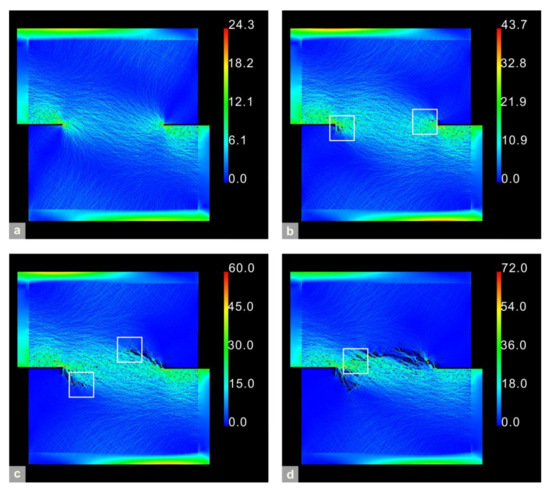 The shear stress field of NT2.7MPa at the (a) 11th, (b) 20th, (c) 29th, and (d) 32nd steps, corresponding to the critical state of crack initiation, volume-expansion, and peak-stress points and rupture of the rock bridge. The white boxes denote the regions of stress concentration at the tips of preexisting joint or cracks. Characteristic events occur at the centers of the boxes in (b).