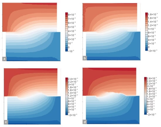 The shear displacement of NT2.7MPa at the (a) 11th, (b) 20th, (c) 29th, and (d) 32nd steps.