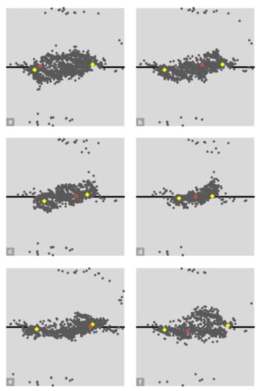 The spatial distribution of AE events in models with (a) σn = 1.9 MPa, (b) σn = 3.6 MPa, (c) r = 70 mm, (d) r = 50 mm, (e) σ0 = 160 MPa, and (f) σ0 = 480 MPa. The yellow diamonds and red solid circles denote the characteristic events and mainshocks, and the grey solid circles indicate other events.