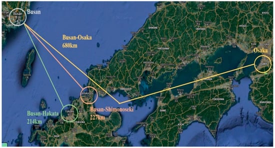 Geographical description of Busan–Hakata, Busan–Shimonoseki, Busan–Osaka routes. Source: adapted from Google Map.