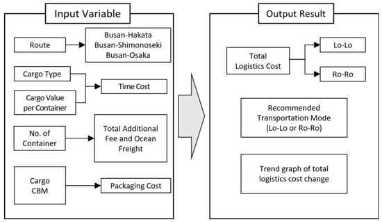 To build this model, this study develops a program that inputs cargo and route-related information, and accordingly presents the total logistics cost as well as the recommended transportation method between Lo-Lo and Ro-Ro. Figure 3 shows the operation process and the logic of the program.