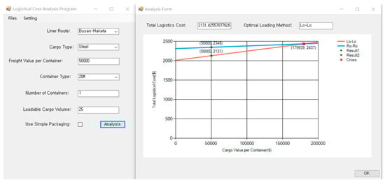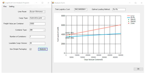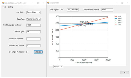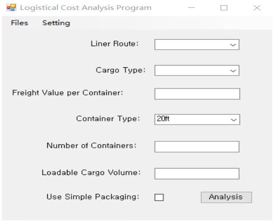 In estimating the total logistics cost, C# is used to develop a transportation mode selection program for Busan–Japan routes and the interface is presented in Figure 4. C# is a modern, universal and object-oriented programming language. As it is highly efficient and easy to develop a visual operation interface, C# is suitable for the needs of the current research.