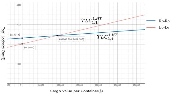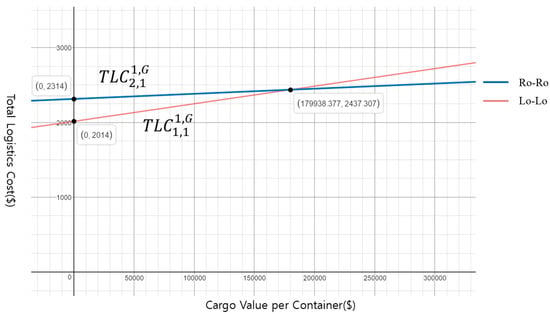 With the same logic, the total logistics costs of Lo-Lo and Ro-Ro per TEU container for high-priced and time-sensitive cargo are shown in Equations (10) and (11), respectively, and Figure 7 presents the total logistics cost function as the cargo value changes.