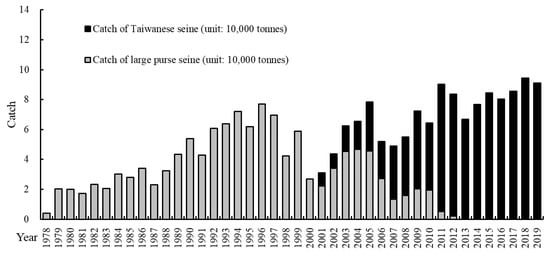 World production of Scomber japonicus (Chub mackerel) and Scomber australasicus (blue mackerel) was approximately 1.6 million tons in 2016 []. Only 2% of the total catch was blue mackerel, which was distributed across several countries, including Asian countries, such as Japan, Korea, Taiwan, and more. Japan had a higher mackerel production than Taiwan and Korea, with a total catch of 517,602 tons in 2017. According to the Japan Statistical Yearbook 2018 [], this total catch had more chub mackerel than blue mackerel. However, Taiwan’s mackerel fishery differed; blue mackerel dominated the catch production almost every year. In addition, blue mackerel, which is a crucial target species in Taiwan, was >50% of the mackerel catch. Blue mackerel is primarily distributed along the continental shelf of the East China Sea (ECS) from north of the Pacific coast of Japan to the South China Sea []. Mackerel fisheries play a crucial role in Taiwanese fisheries, and as such, the total catch has increased since 1978. The output of a mackerel fishery has been between 70,000 and 85,000 tons in recent years. The increase in total mackerel catch was supported by the gradual replacement of large purse seines, which have completely disappeared since 2013, with Taiwanese seines (Figure 1). Studies have reported that the minimum and medium sexually mature body lengths have decreased []; this decrease may be due to overfishing or global warming. The Taiwanese government has implemented regulations for fishing. In 2013, fishing activity was banned in June of each year, and since 2018 no fishing activity has been permitted between December 29 and January 8 in the lunar year calendar. The total duration of the fishing ban is 50 days each year. The main purpose of these regulations is to protect spawning grounds during the spawning season, which is a major concern of the public.