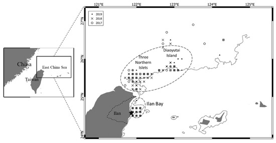 The variation in fecundity among species reveals differences in reproductive strategies []. Fecundity is the ability to produce numerous offspring in one spawning event, and BF is the total number of oocytes released in a single batch. BF is estimated using the DEPM, in which the number of hydrated eggs (stage IV) contained in ovaries is counted. Spawning frequency is the average number of days between the spawning events of individual female fish []. According to Hunter and Macewicz [] and Hunter and Goldberg [], spawning frequency can be estimated using the incidence of postovulatory follicles (POFs). The estimation of spawning frequency requires a mature sample during the spawning season. POFs appear in the ovary after hatching and can be observed in histological tissue under microscopy. Ward et al. [] and Rogers et al. [] reported that POFs could be identified in the ovaries of blue mackerel for up to 24 h after spawning, and that they may differ from those of other species due to the water temperature and other environmental factors. The ECS is rich in nutrients and is crucial in supporting the growth of pelagic species, including mackerel. The northern waters of Taiwan are vital spawning grounds for blue mackerel in the ECS. This area comprises the southern part of the ECS, from the Diaoyutai Island (known as Senkaku Island in Japan)—three northern islets—to the south of Yilan Bay (Figure 2). Blue mackerel from the ECS and coastal waters of Taiwan were demonstrated to be of the same stock []. Differences in the ecological characteristics of these habitats should be considered. However, the goal of this study was to determine the current status of blue mackerel to facilitate resource management of blue mackerel in Taiwan. This goal was achieved by determining the reproductive biology of blue mackerel in northeastern Taiwan by measuring size at maturity, fecundity, BF, and spawning frequency.