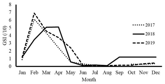 The GSI could be observed to determine the spawning season. The GSI increased gradually from January, reaching a maximum in March and April. The GSI then decreased, reaching a minimum in May and June. The peak GSI for female fish indicated the predominance of stages III and IV in February, March, and April, determined through histological section observation. According to the GSI data, the blue mackerel spawning season was from February to May, or from late winter to early summer. However, this period differed each year. In 2017, the GSI increased from January and sharply decreased in May. In 2018, the GSI slowly increased from January and remained high for several months; the same result was observed in 2019. In these years, the GSI was high until May (Figure 3).