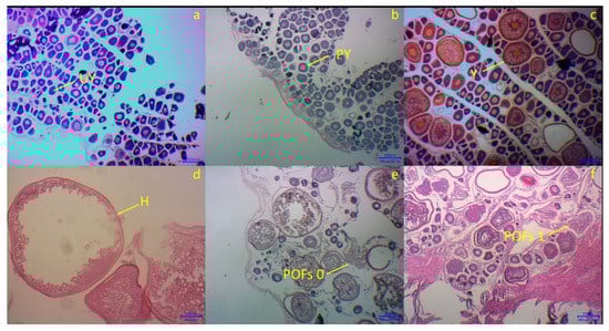 Figure 4a–e presented the microscopic stages of oocyte development: (a) Immature (stage I), ovary with unyolked (UY) and small oocytes; (b) Maturing/partially yolked (PY), the oocytes had a large nucleus; (c) Mature (yolked)/vitellogenic oocytes, yolk formation in oocytes; (d) Hydrated oocytes (H) (stage IV), showed the biggest diameter of oocytes and the GSI value sharply increased; (e) Spent, atretic (stage V), some oocytes hatched to the environment, known by existing of POFs (day 0 and day 1), unyolked, partially yolked and yolked oocytes co-existing with POFs.