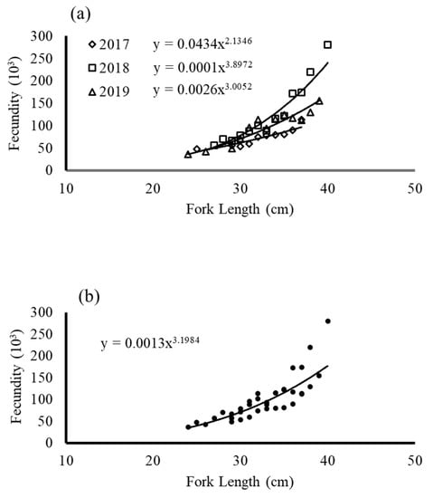 Relationship of fecundity and fork length (a) each year and (b) three years combined.