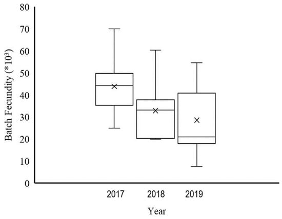 Box plots of batch fecundity by year. The centerline of each box represents the median, and the cross symbol indicates the mean of batch fecundity; minimum and maximum values are displayed.