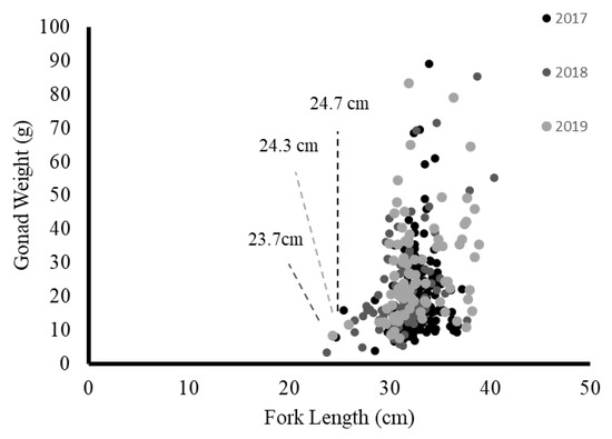 L50% was estimated as 32.02, 32.13, and 29.64 cm in 2017, 2018, and 2019, respectively (Figure 7). The minimum size at sexual maturity was 24.7, 23.7, and 24.3 cm in 2017, 2018, and 2019, respectively (Figure 8). In this study, all females with FL of >39 cm were considered “mature”.
