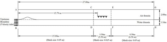 where η represents the wave height time history, H is the water depth, and u is the wave velocity. The mesh size of the ALE domain far from the bridge deck is 0.05 m, while in the region of CDEF the mesh size of both the ALE domain and the bridge deck model is refined to 0.025 m.