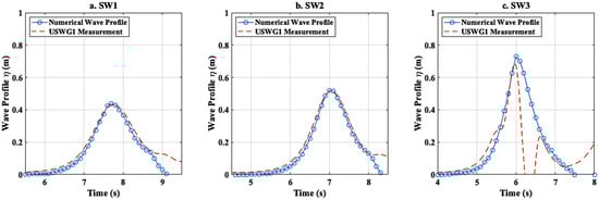 This experimental work was selected as a benchmark due to its extensive instrumentation that enabled the accurate quantification of both the hydrodynamic characteristics and the effects on the deck, including pressures at different locations on the girders and the slab, and forces measured by load cells at the interface between the superstructure and the substructure. For the current study, the experimental configuration with open chambers (i.e., cross-frames) and rigid connections, which was tested under the impact of four unbroken solitary wave heights and water depth of 1.16 m, will be used. To verify the accuracy of the numerical method, the simulated wave profiles of SW1, SW2, SW3 and SW4, with corresponding heights equal to H = 0.43, 0.52, 0.68 m and 0.97 m are compared with the ultrasonic wave gauge measurements located at 0.92 m in front of the bridge deck. As shown in Figure 2, the numerically predicted wave profile histories agree well with the experimental data, both in terms of maximum values and temporal evolution, with some shape differences at the tail of the wave. These differences are more obvious for the large waves, e.g., SW3, and this could be due to the fact that in the experimental tests as the wave height increases the solitary wave undergoes a more significant shoaling process with nonlinear effects that change the shape of the wave. These effects cannot be captured in the truncated numerical model because the shoaling process is not simulated in the numerical model. Nonetheless, the solitary waves of the numerical model compare well with the experiments in terms of maximum height (in front of the deck), with the error ranging between 0.6% and 6.4%, allowing us to proceed further with the comparison of the wave-induced effects on the deck.