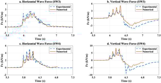 Comparison of wave force histories obtained from the experiments of Istrati [19] and the numerical simulations for SW3 and SW4.