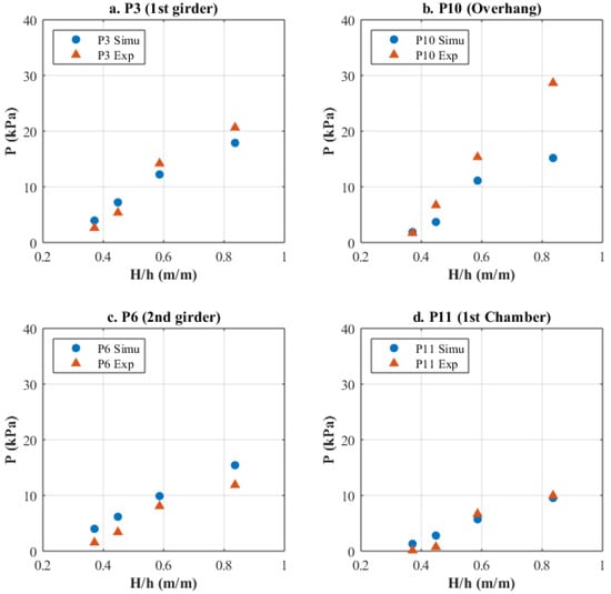 Comparison of maximum pressure at selected locations obtained from the experiments of Istrati [19] and the numerical simulations.